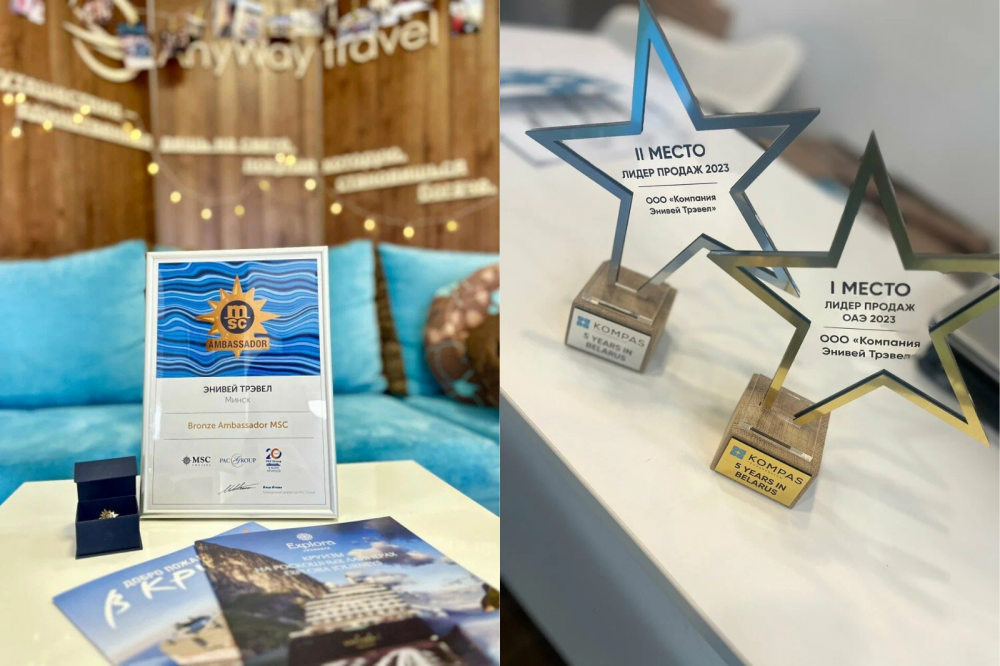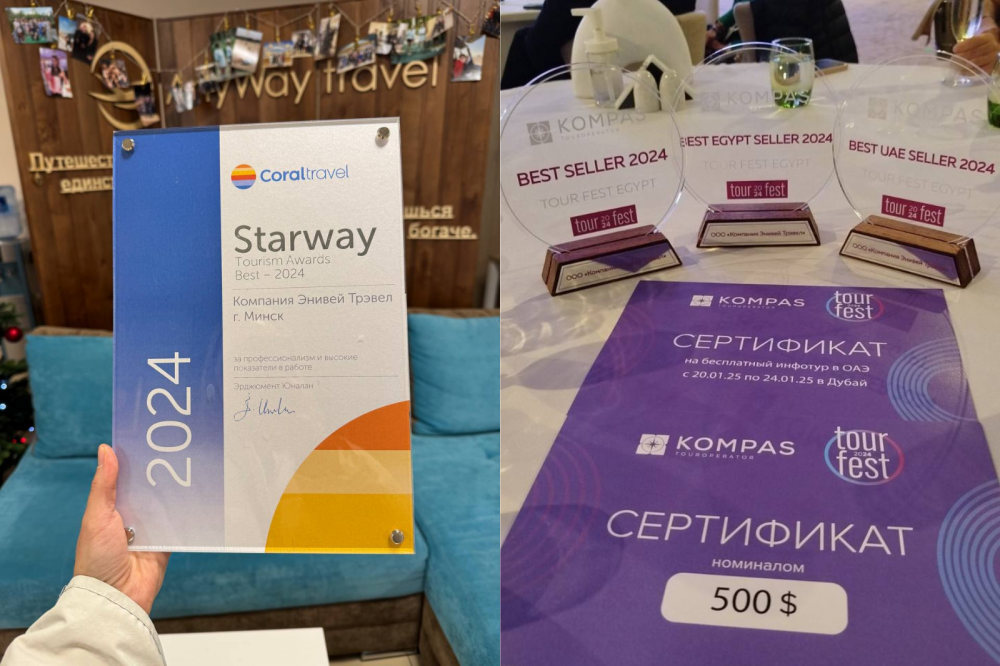 - В 2024 году — 3-е место по продажам у туроператора Kompas, 1-е — в направлении Эмираты, 3-е — в Египте. Стали победителями премии Starway Coral Travel в категории BEST.