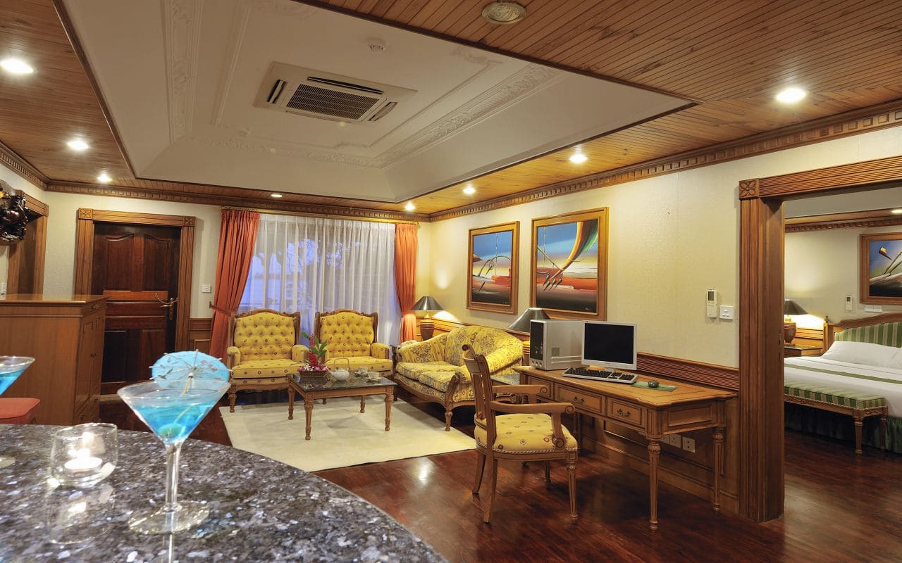 4 Two-Bedroom Overwater Suite (201 м2, макс. 4 или 4+2 чел.). Одноэтажные водные бунгало. Две спальни (в одной кровать King size, во второй - две раздельные Twin) и отдельная гостиная, 3 ванные комнаты, компьютерный стол в гостиной. Терраса с джакузи. Прямой спуск в океан. Дополнительные спальные места - 2 софы.