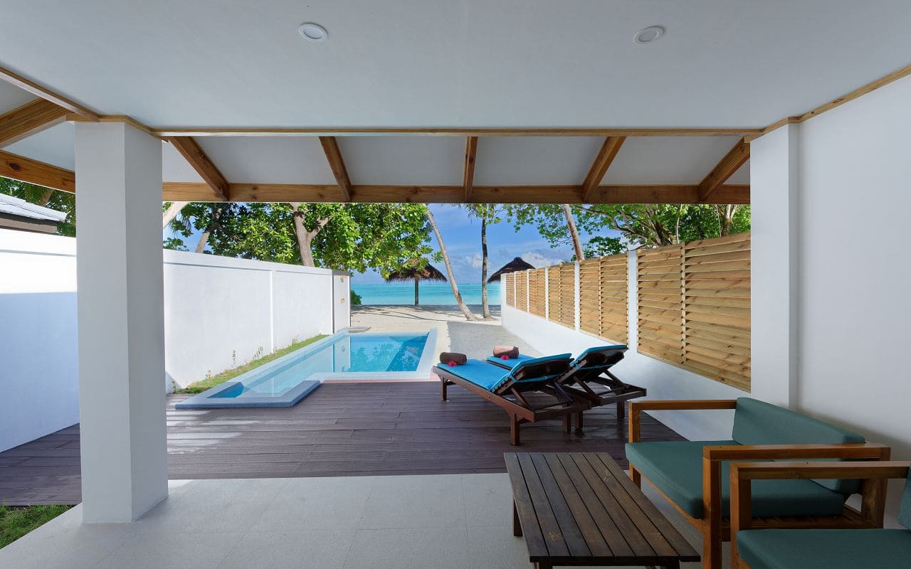 53 Beach Pool Villa (121 м2, макс. 3 или 2+1 чел.). Береговые бунгало, расположенные в блоках на 2 номера. Спальня, софа, кондиционированная ванная комната с ванной, душ на открытом воздухе. Терраса с шезлонгами и частным бассейном (18 м2). Дополнительное спальное место для третьего человека - на имеющейся в номере софе.