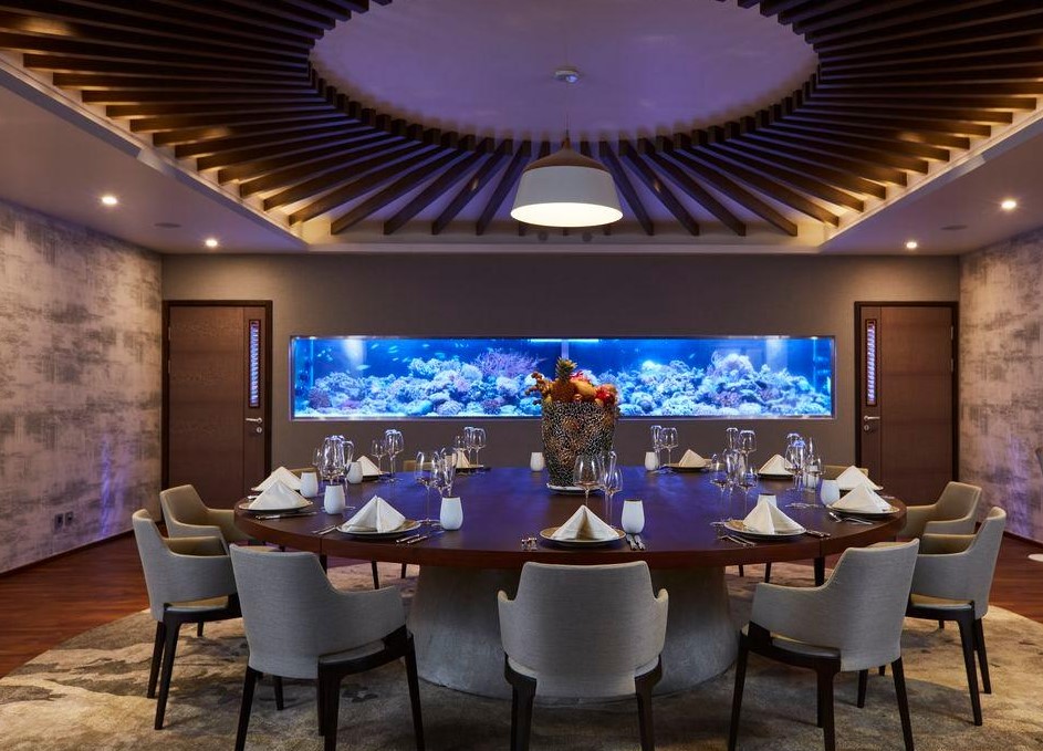 Barium – эксклюзивный и уединенный частный обеденный зал с потрясающим аквариумом с красочными рыбами, идеально подходящий для друзей и семей.