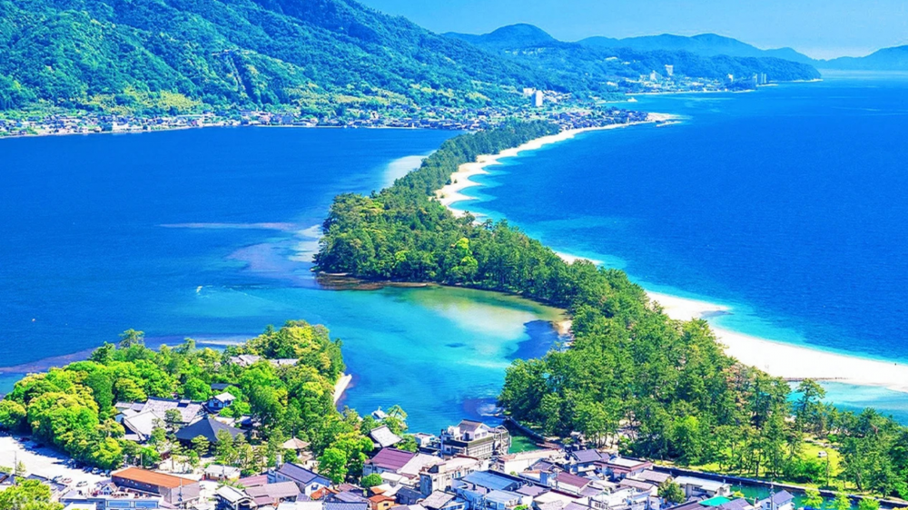 Канатная дорога к песчаной косе Аманохасидате. Один из трех лучших пейзажей Японии. Легенда: если встать вниз головой, коса «парит» в небе.